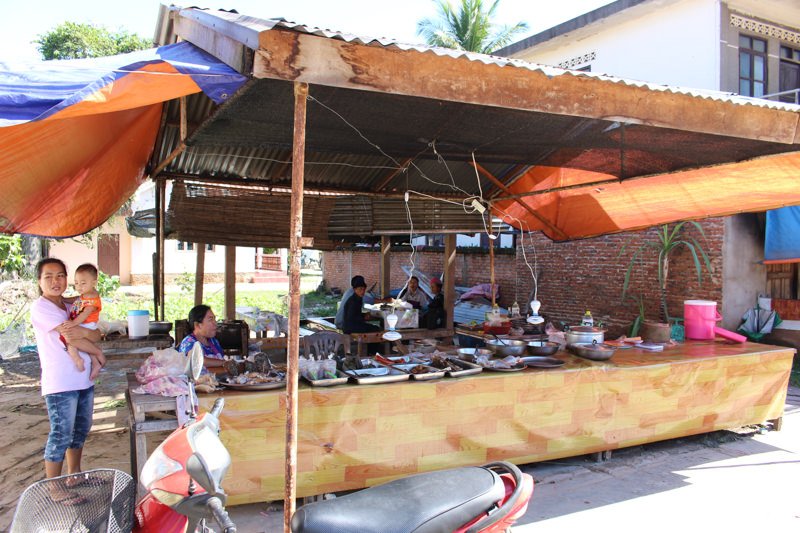 生春巻き4つ(5000キープ)、ビール(10000キープ)、おかず屋さんで鶏肉の炒め物(15000キープ)とカオニャオ(5000キープ)。