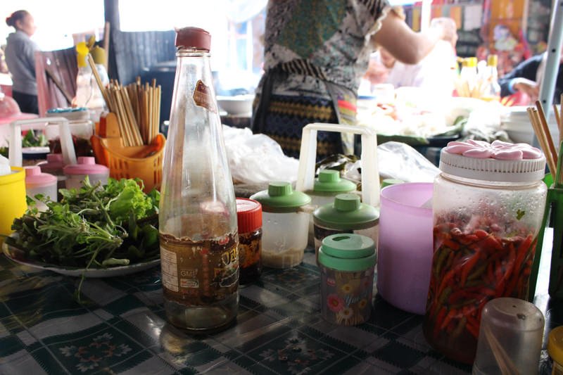 ▼地元の人は調味料を色々入れて自分の味にする