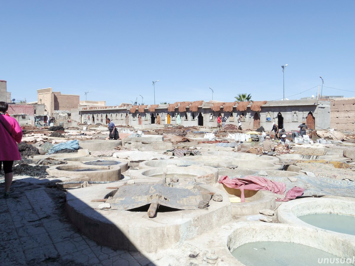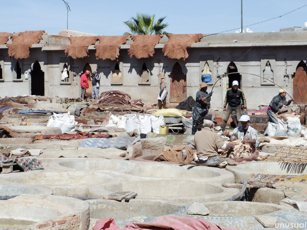 旧市街の中には、バブーシュをはじめとした各種の革製品を扱う商店や、羊の皮をなめす作業場、革工房が点在しています。