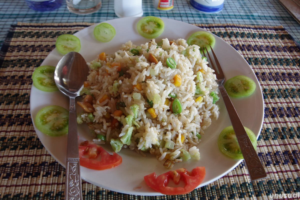 メニューに、「Rice salad」ってやつがあって頼んでみたら、ラペソー(茶葉でできた漬物のようなもの)が混ざったチャーハンみたいなのだった。