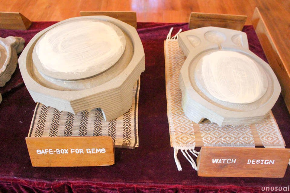 色々な木。色々なデザインのタナカを擦る石の道具。