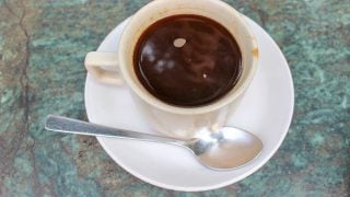 朝食はチーズを塗ったクレープとホットカフェオレが合わせて7DH(約85円)。