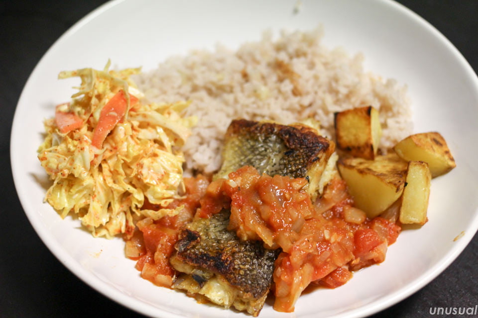 焼いたバカリャウにトマトソースをかけて食べることにしましたが、ポルトガルにこのような料理があるかは不明です。