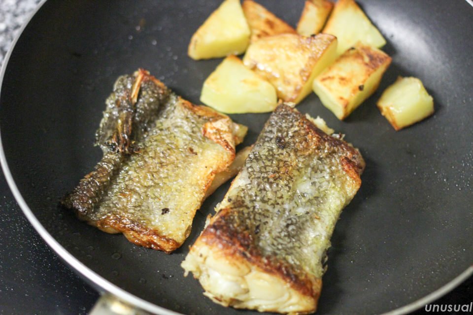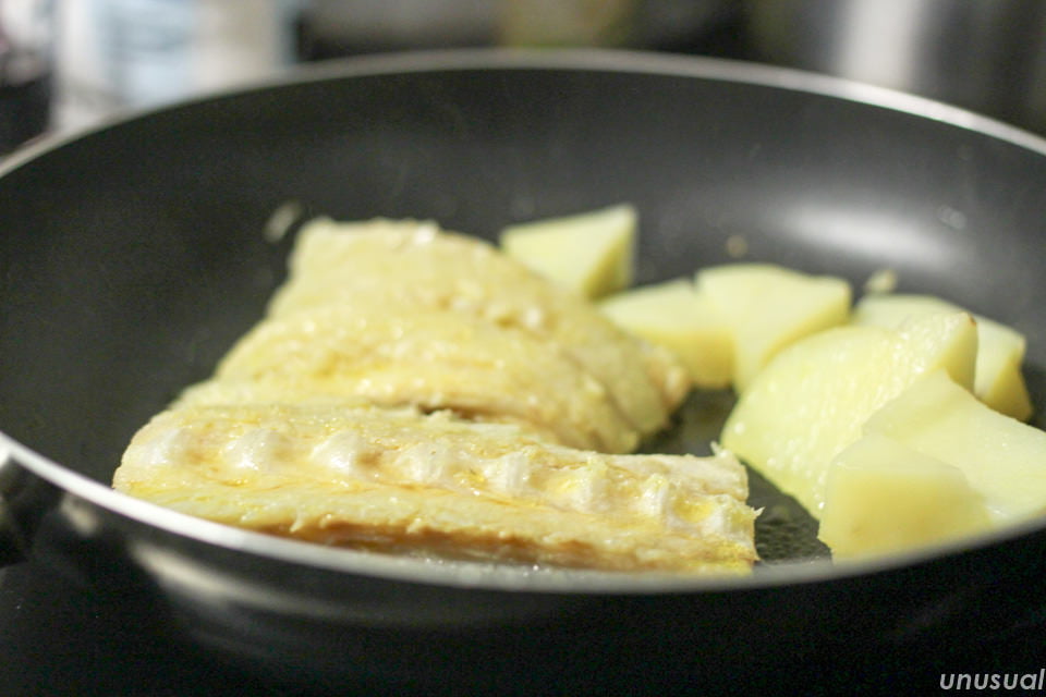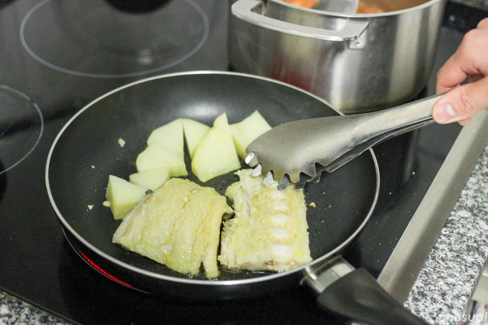 バカリャウ料理を調べてみると、骨から身をはがしてほぐしたりと手間のかかる料理が多かったので、今回は一番簡単な、丸ごとフライパンで焼くという調理をします。