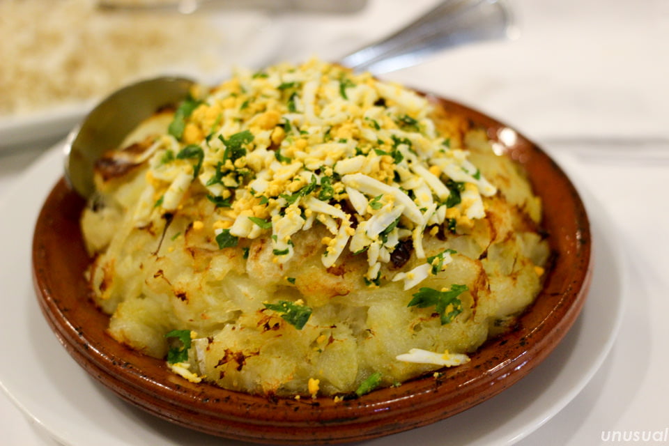 バカリャウとじゃがいも、玉ねぎをまとめたものを、オリーブオイルをかけてオーブンで焼き、ゆで卵でトッピングしたものです。
