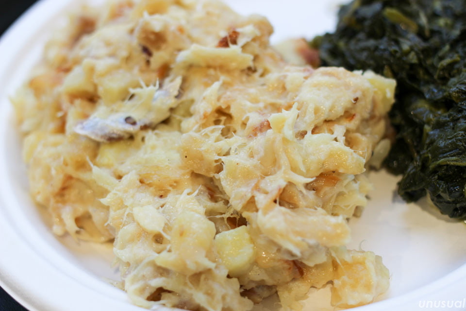 バカリャウと玉ねぎ、じゃがいもが入っていて、(写真には写っていませんが)チーズの焦げ部分がカリカリでおいしかったです。