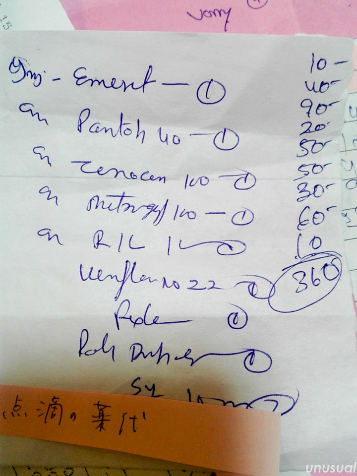 そこで、先ほど先生が書いてくれた紙を見せて点滴剤を受け取り、その場でお金を払った。