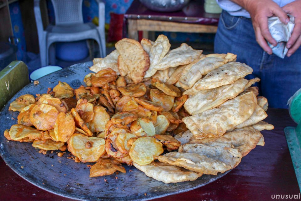 道端の屋台で揚げ餃子風サモサや野菜の揚げ物を売っていたので少し買っておやつにした。
