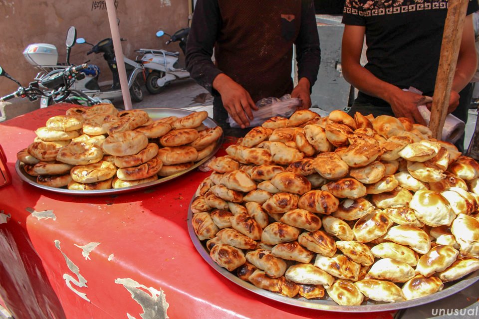 ▼街なかで売っている羊肉入りパン。肉の味が濃くておいしい