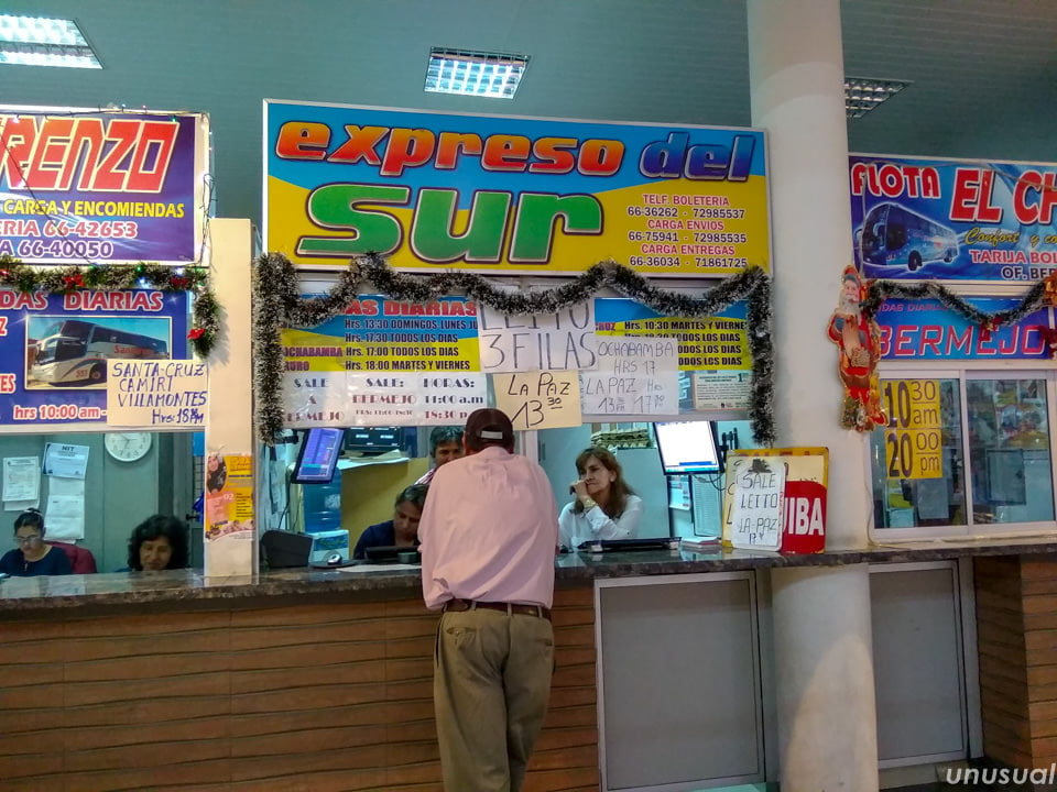 数年前の情報では300ボリビアーノだと聞いていましたが、係の女性には480ボリビアーノ(サンタ・クルス発と同じ料金)だと言われました。