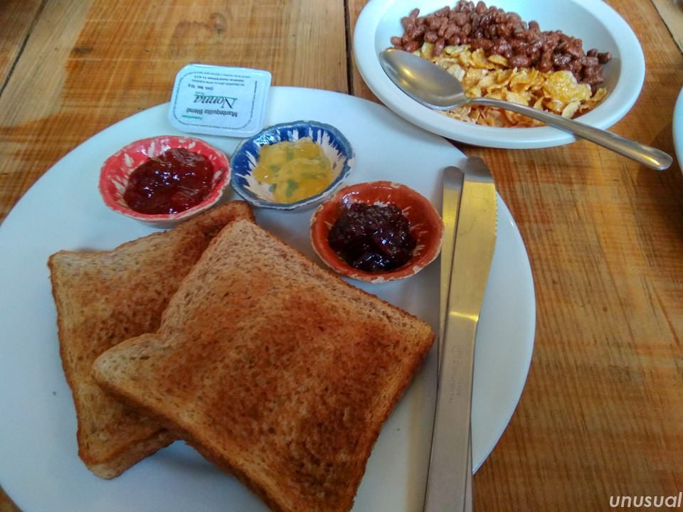 →朝食が付きます。内容はコーンフレーク、パン、ジャム、コーヒーなど。ハムやチーズなどはありませんでした。朝食は8時半からですが、その少し前からでも食べられました。