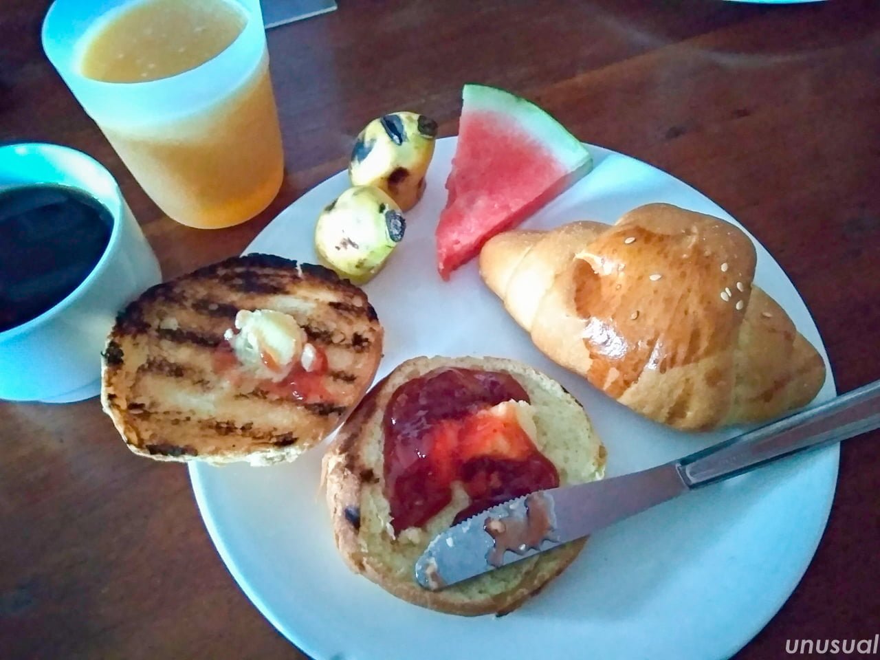 →バイキング形式の朝食付きで、パン・バター・ジャム・コーヒー・ジュースなどが用意されています。