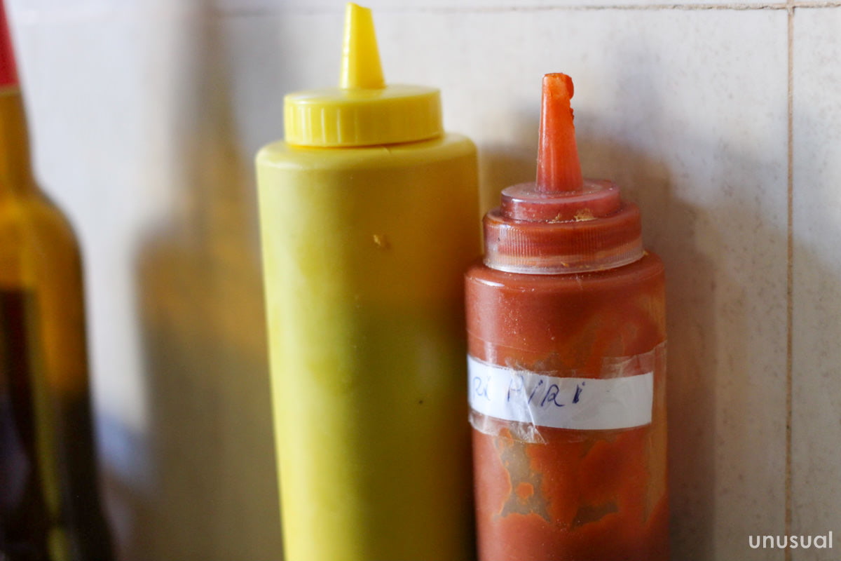 隣のおじさんは、置いてあるピリピリとマスタードをかけて、自分好みの味にして食べていた。
